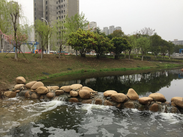 本工程造價約280萬元,主要對環(huán)形景觀帶進行岸線規(guī)整、雨水口護砌、河道清淤,并種植沉水、挺水植物,設置景觀攔水壩及人工填料,改善河道水質(zhì),提升景觀效果。