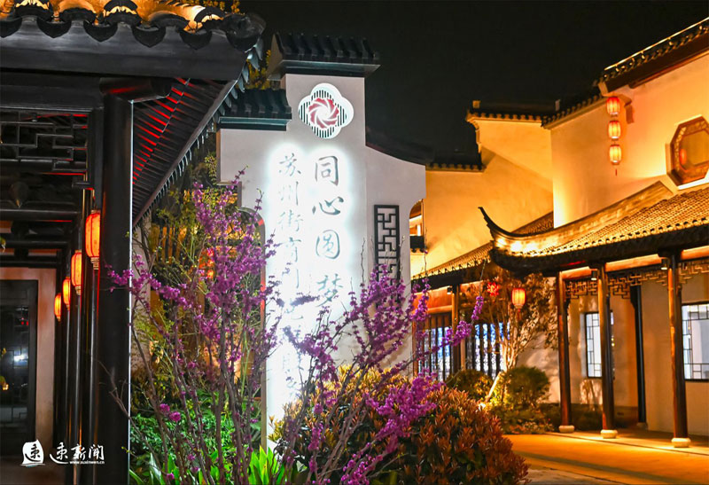 3月31日,蘇州街盛開的櫻花、海棠、玉蘭與蘇式街區(qū)相互映襯,美不勝收。