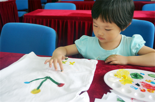 來自園區(qū)各居民小區(qū)的十余名小朋友參加了開班課程,他們在家長的陪同下,參加了第一期“親子DIY”課程,用自己的小手、畫筆在白凈的T恤上自由發(fā)揮,一幅幅“杰作”便在“神筆馬良”筆下誕生。